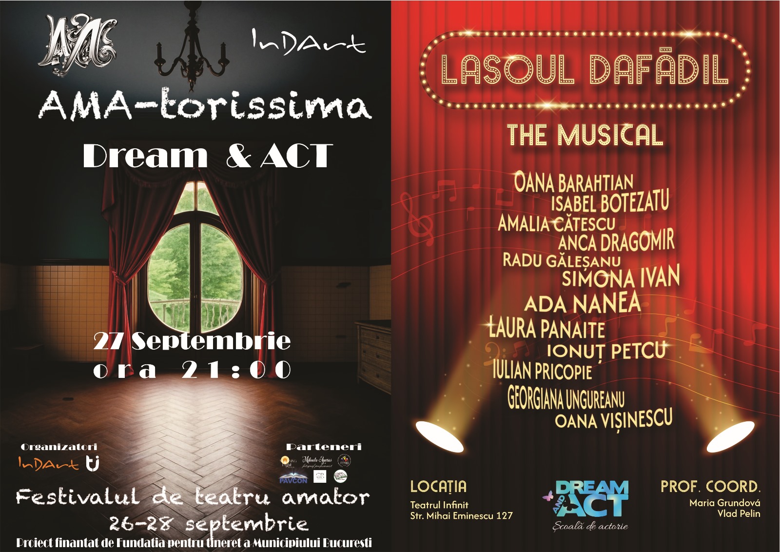 25 septembrie 2025, ora 19:00, Terasa nJOY – Mihai Bravu 223 “De | Conectare cu Dream&Act”CONCERT VLADyMARY 27 septembrie 2025, ora 21:00, Teatrul Infinit “Lasoul Dafădil – the musical”AMA-torissima, festivalul dedicat actorilor amatori 30 septembrie 2025, ora 19:00, Dream&Act “ Curs Actorie- nivel avansat”Curs de Actorie pentru Amatori – nivel începători 2 octombrie 2025, ora 19:00, Dream&Act “ Curs Actorie- nivel intermediar”Curs de Actorie pentru Amatori – nivel începători 8 octombrie 2025, ora 19:00, Dream&Act “ Curs Musical – nivel începători”Curs de Musical pentru Amatori – nivel începători 11 octombrie 2025, ora 19:00, Teatrul Vasilache București “Ultimul Loz”de Virginia Vasilache – Teatrul Vasilache, regia Virginia Vasilache 30 octombrie 2025, ora 18:00, Teatrul „George Ciprian” Buzău “O noapte furtunoasă”de I.L. Caragiale – Teatrul „George Ciprian” Buzău, regia Daniel Bucur 4 noiembrie 2025, ora 18:00, Teatrul „George Ciprian” Buzău “Chirița în provinție”de Vasile Alecsandri – Teatrul „George Ciprian” Buzău, regia Daniel Bucur 14 noiembrie 2025, ora 18:00, Teatrul „George Ciprian” Buzău “O noapte de pomină”de Derek Benfield– Teatrul „George Ciprian” Buzău, regia Daniel Bucur 23 noiembrie 2025, ora 18:00, Teatrul „George Ciprian” Buzău “O noapte furtunoasă”de I.L. Caragiale – Teatrul „George Ciprian” Buzău, regia Daniel Bucur 30 noiembrie 2025, ora 18:00, Teatrul „George Ciprian” Buzău “Bolnavul închipuit”de Molière– Teatrul „George Ciprian” Buzău, regia Daniel Bucur 6 decembrie 2025, ora 18:00, Teatrul „George Ciprian” Buzău “O noapte de pomină”de Derek Benfield– Teatrul „George Ciprian” Buzău, regia Daniel Bucur 14 decembrie 2025, ora 18:00, Teatrul „George Ciprian” Buzău “O noapte furtunoasă”de I.L. Caragiale – Teatrul „George Ciprian” Buzău, regia Daniel Bucur 15 decembrie 2025, ora 18:00, Teatrul „George Ciprian” Buzău “O noapte furtunoasă”de I.L. Caragiale – Teatrul „George Ciprian” Buzău, regia Daniel Bucur 16 decembrie 2025, ora 18:00, Teatrul „George Ciprian” Buzău “O noapte furtunoasă”de I.L. Caragiale – Teatrul „George Ciprian” Buzău, regia Daniel Bucur Abonează-te la newsletter!Descoperă arta prin ochii Mariei Grundová și găsește inspirație pentru a-ți urmări pasiunile artistice! Name Email Checkbox TitleSunt de acord cu prelucrarea datelor personale SubmitThe form has been submitted successfully!There has been some error while submitting the form. Please verify all form fields again.
